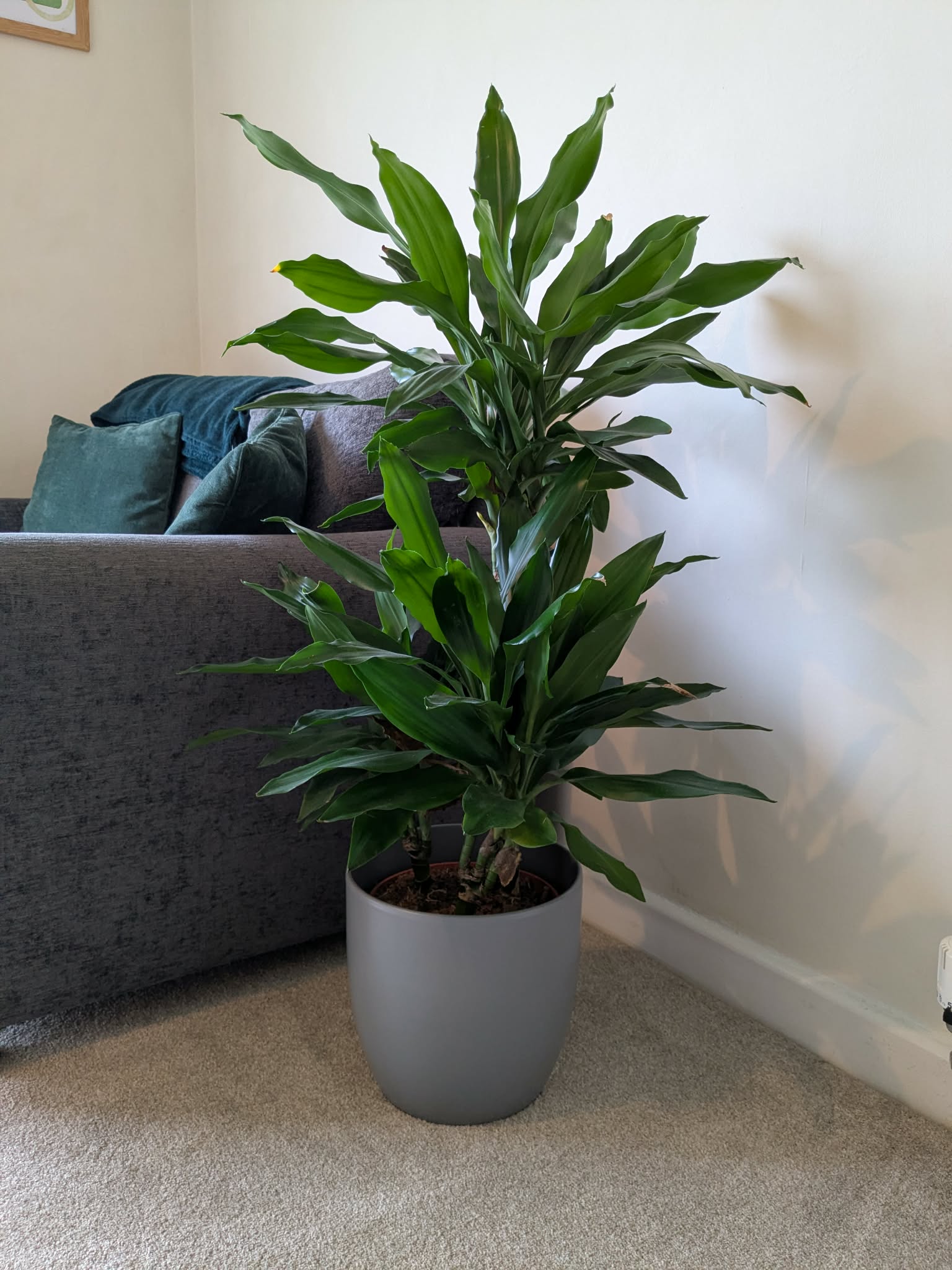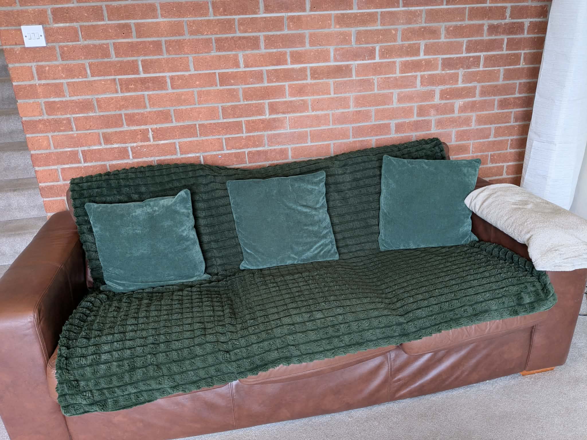 Let me share a personal example – I love plants and I love the colour green. All our walls and the majority of our furniture are neutral colours. I wanted to add a pop of colour and bring a piece of nature inside my living room. As you can see in the pictures below I have a green throw blanket over my sofa, this is easy to shake off or throw in the washing machine to clean. My big plant is easy to water and doesn’t take much maintaining, but it gives people a glimpse of my style.