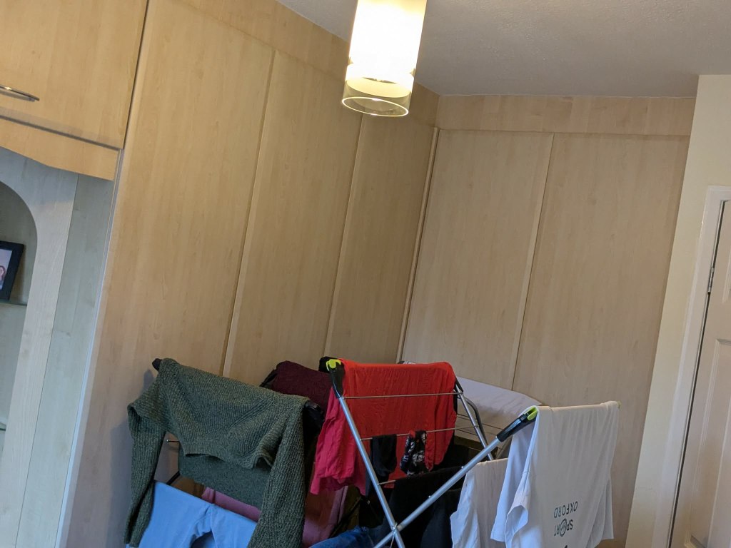 The previous owners added built in wardrobes into one of the bedrooms, but in doing this they made a medium sized bedroom feel quite small. At present we can fit a double bed in the room for guests and we also dry our laundry in that room, but apart from that there isn’t much space for anything else. We hope that one day this could be a room for one or two children, or a bedroom for Andy and I if our children needed a bigger bedroom to share. We hope later this year to remove the built in wardrobes, plaster and paint and re-carpet the bedroom. We will most likely use this room as an office and guest bedroom until our home is filled with children, which hopefully will be soon.